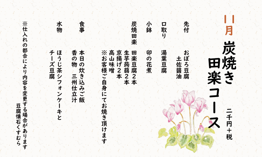 お客様ご自身で楽しめる炭焼き田楽のコースです。