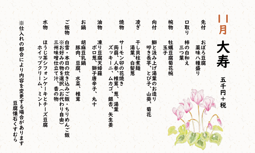 記念日におすすめのケーキや、記念日に合わせた特別料理、欲しい分だけ頼める豆腐懐石の単品料理のご紹介です。