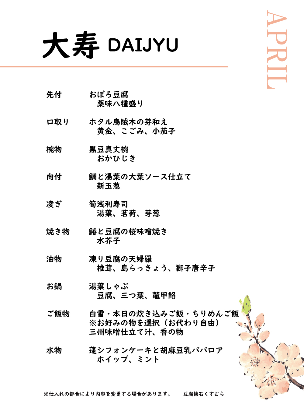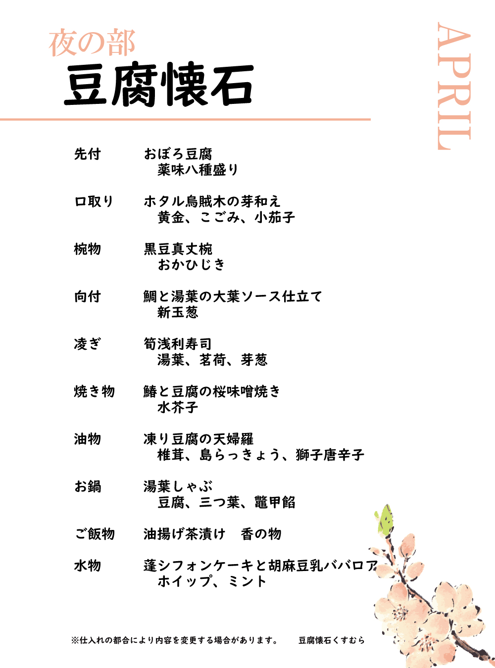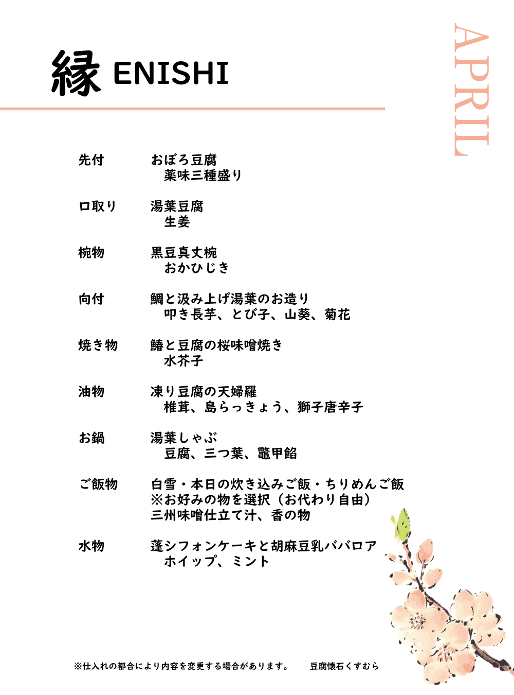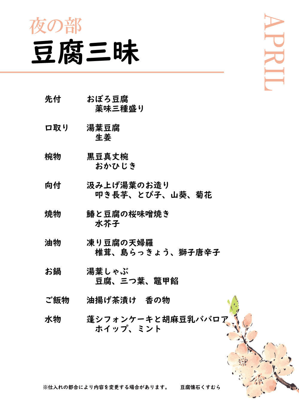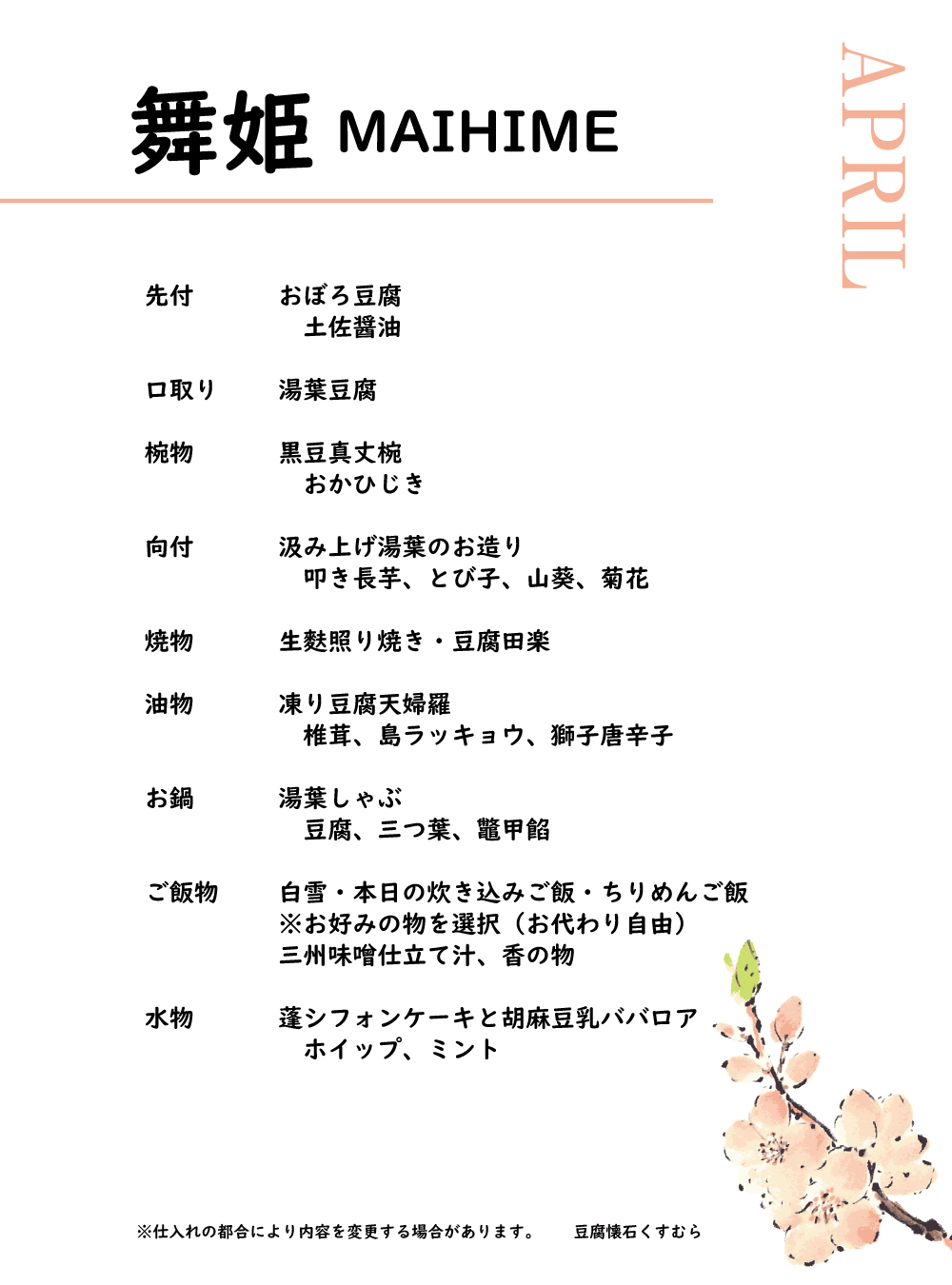 月ごとに献立が変わるため、季節の移ろいとともに、豆腐料理の魅力をお楽しみください。