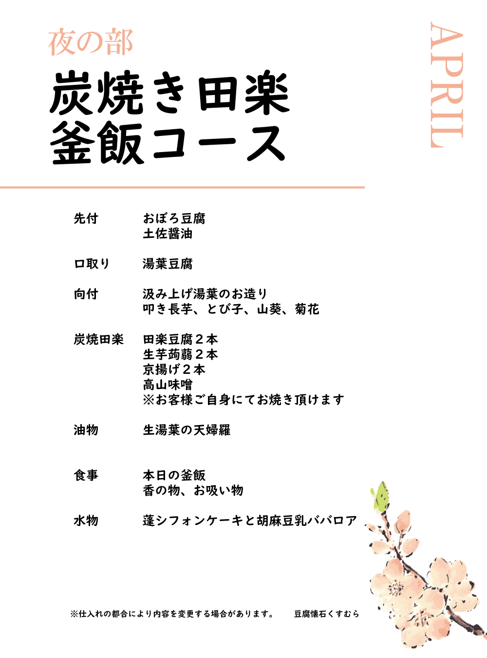 昼の「豆腐御膳」と「炭焼き田楽コース」は2025年12月に終了いたしました。